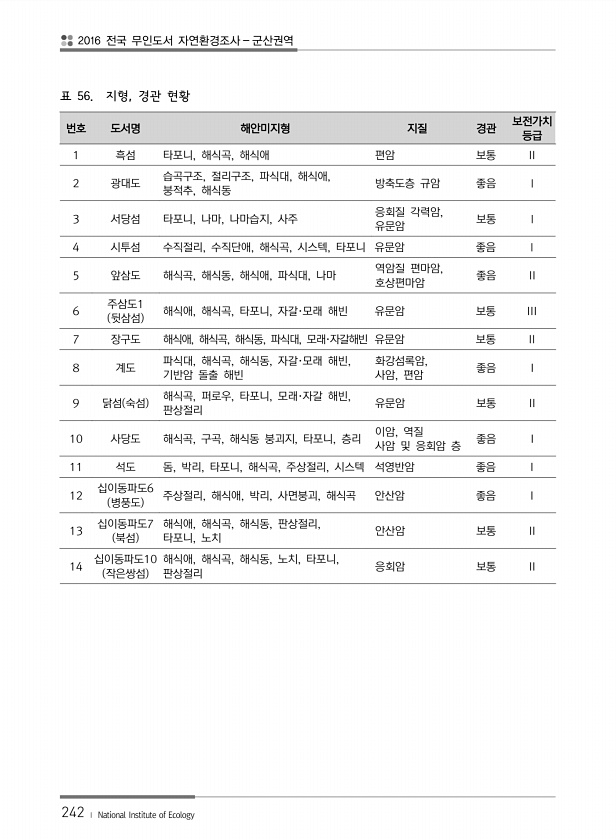 2016 전국 무인도서 자연환경조사 군산권역 242 ? National Institute of Ecology 번호 도서명 해안미지형 지질 경관 보전가치 등급 1 흑섬 타포니, 해식곡, 해식애 편암 보통 II 2 광대도 습곡구조, 절리구조, 파식대, 해식애, 붕적추, 해식동 방축도층 규암 좋음 Ⅰ 3 서당섬 타포니, 나마, 나마습지, 사주 응회질 각력암, 유문암 보통 Ⅰ 4 시투섬 수직절리, 수직단애, 해식곡, 시스텍, 타포니 유문암 좋음 Ⅰ 5 앞삼도 해식곡, 해식동, 해식애, 파식대, 나마 역암질 편마암, 호상편마암 좋음 II 6 주삼도1 뒷삼섬 해식애, 해식곡, 타포니, 자갈·모래 해빈 유문암 보통 III 7 장구도 해식애, 해식곡, 해식동, 파식대, 모래·자갈해빈 유문암 보통 II 8 계도 파식대, 해...
