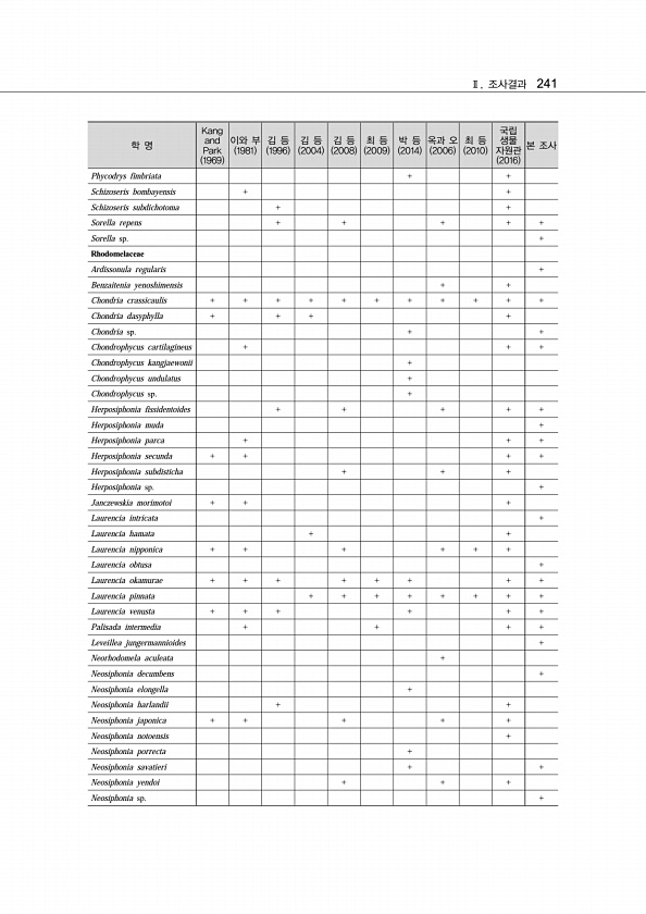 Ⅱ. 조사결과 241 학 명 Kang and Park 1969 이와 부 1981 김 등 1996 김 등 2004 김 등 2008 최 등 2009 박 등 2014 옥과 오 2006 최 등 2010 국립 생물 자원관 2016 본 조사 Phycodrys fimbriata + + Schizoseris bombayensis + + Schizoseris subdichotoma + + Sorella repens + + + + + Sorella sp. + Rhodomelaceae Ardissonula regularis + Benzaitenia yenoshimensis + + Chondria crassicaulis + + + + + + + + + + + Chondria dasyphylla + + + + Chondria sp...