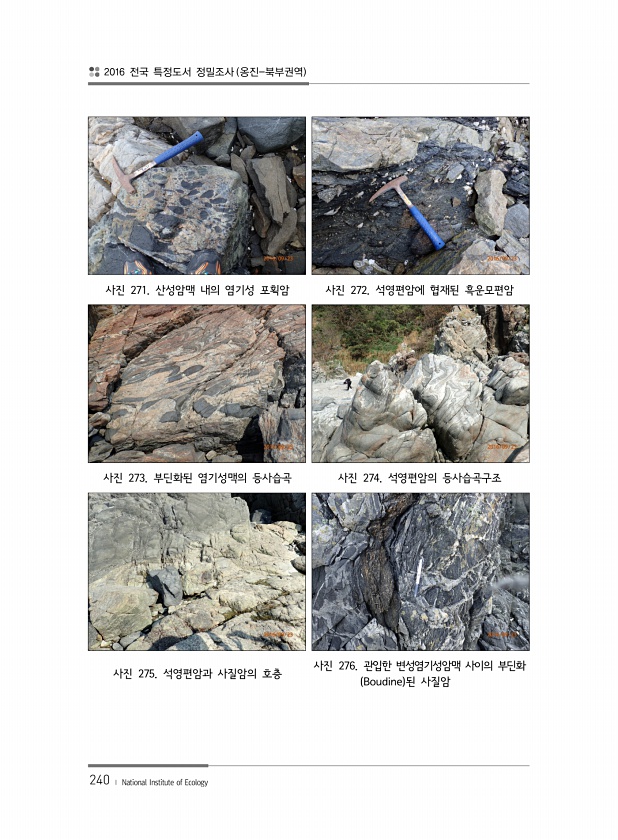 2016 전국 특정도서 정밀조사 옹진-북부권역 240 ? National Institute of Ecology 사진 271. 산성암맥 내의 염기성 포획암 사진 272. 석영편암에 협재된 흑운모편암 사진 273. 부딘화된 염기성맥의 등사습곡 사진 274. 석영편암의 등사습곡구조 사진 275. 석영편암과 사질암의 호층 사진 276. 관입한 변성염기성암맥 사이의 부딘화 Boudine 된사질암