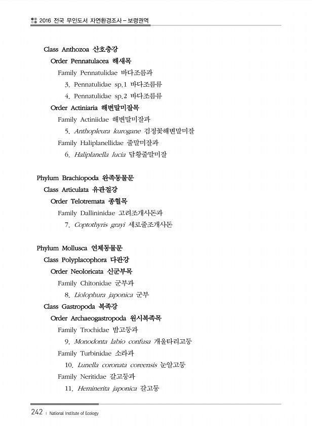 2016 전국 무인도서 자연환경조사 보령권역 242 ? National Institute of Ecology Class Anthozoa 산호충강 Order Pennatulacea 해새목 Family Pennatulidae 바다조름과 3. Pennatulidae sp.1 바다조름류 4. Pennatulidae sp.2 바다조름류 Order Actiniaria 해변말미잘목 Family Actiniidae 해변말미잘과 5. Anthopleura kurogane 검정꽃해변말미잘 Family Haliplanellidae 줄말미잘과 6. Haliplanella lucia 담황줄말미잘 Phylum Brachiopoda 완족동물문 Class Articulata 유관절강 Order Telotremata 종혈목 Family ...