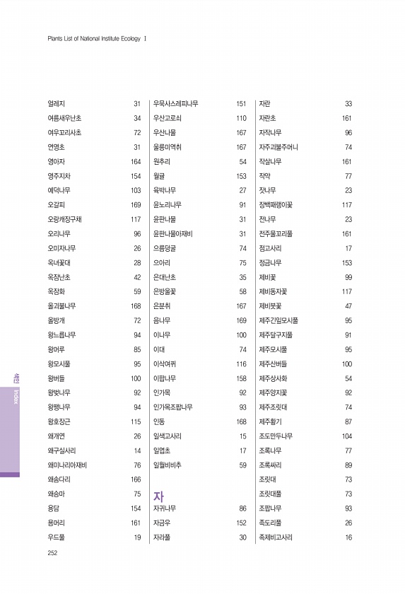 252 색인 Index Plants List of National Institute Ecology Ⅰ 얼레지 31 여름새우난초 34 여우꼬리사초 72 연영초 31 영아자 164 영주지차 154 예덕나무 103 오갈피 169 오랑캐장구채 117 오리나무 96 오미자나무 26 옥녀꽃대 28 옥잠난초 42 옥잠화 59 올괴불나무 168 올방개 72 왕느릅나무 94 왕머루 85 왕모시풀 95 왕버들 100 왕벚나무 92 왕팽나무 94 왕호장근 115 왜개연 26 왜구실사리 14 왜미나리아재비 76 왜솜다리 166 왜승마 75 용담 154 용머리 161 우드풀 19 우묵사스레피나무 151 우산고로쇠 110 우산나물 167 울릉미역취 167 원추리 54 월귤 153 육박나무 27 윤노리나무 91 윤판나물 31 윤판나물...
