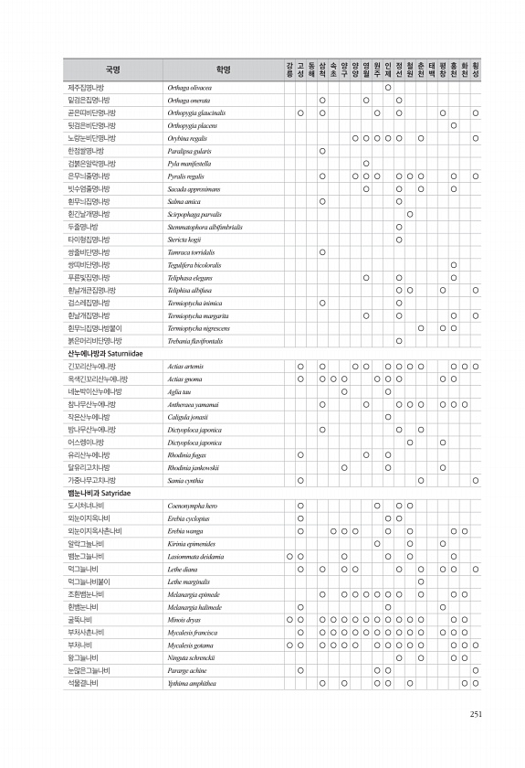 251 제주집명나방 Orthaga olivacea ○ 밑검은집명나방 Orthaga onerata ○ ○ ○ 곧은띠비단명나방 Orthopygia glaucinalis ○ ○ ○ ○ ○ ○ 뒷검은비단명나방 Orthopygia placens ○ 노랑눈비단명나방 Orybina regalis ○ ○ ○ ○ ○ ○ ○ 한점쌀명나방 Paralipsa gularis ○ 검붉은알락명나방 Pyla manifestella ○ 은무늬줄명나방 Pyralis regalis ○ ○ ○ ○ ○ ○ ○ ○ ○ 빗수염줄명나방 Sacada approximans ○ ○ ○ ○ 흰무늬집명나방 Salma amica ○ ○ 흰긴날개명나방 Scirpophaga parvalis ○ 두줄명나방 Stemmatophora albifmbrialis ○ 타이형...