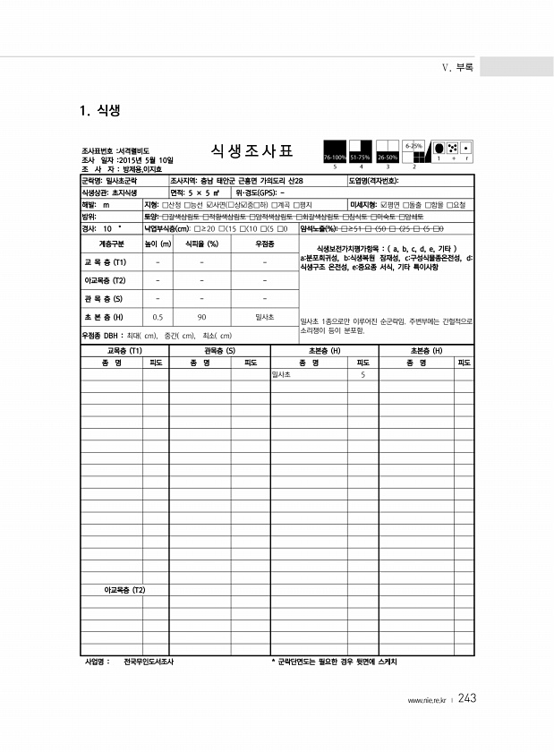 Ⅴ. 부록 www.nie.re.kr ? 243 1. 식생 조사표번호 서격렬비도 조사 일자 2015년 5월 10일 조 사 자 방제용,이지효 식 생 조 사 표 군락명밀사초군락 조사지역충남 태안군 근흥면 가의도리 산28 도엽명 격자번호 식생상관초지식생 면적5 × 5 ㎡ 위·경도 GPS 해발m 지형□산정 □능선 ?사면 ?상?중□하 □계곡 □평지 미세지형?평면 □돌출 □함몰 □요철 방위토양□갈색삼림토 □적황색삼림토 □암적색삼림토 □회갈색삼림토 □침식토 □미숙토 □암쇄토 경사10 ° 낙엽부식층 cm □≥20 ? 15 □ 10 □ 5 □0 암석노출 % □≥51 □〈50 □〈25 □〈5 □0 계층구분 높이 m 식피율 % 우점종 식생보전가치평가항목 a, b, c, d, e, 기타 a분포희귀성, b식생복원 잠재성, c구성식물...