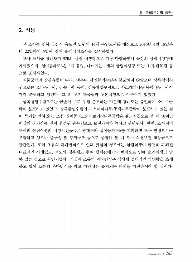 Ⅲ. 종합 분야별 총평 www.nie.re.kr ? 243 2. 식생 본 조사는 전북 군산시 옥도면 일원의 14개 무인도서를 대상으로 2016년 4월 18일부 터 22일까지 5일에 걸쳐 춘계식생조사를 실시하였다. 조사 도서중 광대도가 3개의 삼림 식생형으로 가장 다양하면서 육상의 삼림식생형에 가까웠으며, 십이동파도6은 2개 유형, 나머지는 1개의 삼림식생형 또는 초지-관목림 등 으로 조사되었다. 식물군락의 상관유형에 따라, 냉온대 낙엽활엽수림은 분포하지 않았으며 상록침엽수 림으로는 소나무군락, 곰솔군락 등이, 상록활엽수림으로 사스레피나무-동백나무군락이 각각 분포하고 있었다. 그 외 초지-관목림과 초본식생으로 이루어져 있었다. 상록침엽수림으로는 곰솔이 주로 우점 분포하는 가운데 광대도는 유일하게 소나무군 락이...