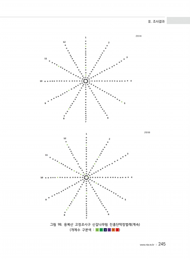 Ⅱ. 조사결과 www.nie.re.kr ? 245 그림 98. 응복산 고정조사구 신갈나무림 진홍단딱정벌레 계속 개체수 구분색