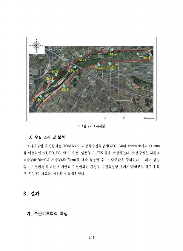 241 그림 2 조사지점 3 수질 조사 및 분석 조사지점별 수질분석은 TOADKK사 다항목수질측정기 WQC-24 와 Hydrolab사의 Quanta 를 이용하여 pH, DO, EC, 탁도, 수온, 염분농도, TDS 등을 측정하였다. 측정방법은 하천의 표층부 020cm 와 저층부 3070cm 를 각각 측정한 후 그 평균값을 구하였다. 그리고 담양 습지 수질환경에 대한 시계열적 수질변화는 환경부 수질측정망 우치지점 영본A, 광주시 북 구 우치동 자료를 이용하여 분석하였다. 3. 결과 가. 수문기후학적특성