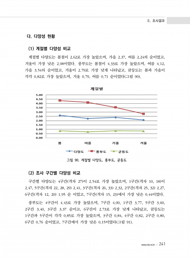 Ⅱ. 조사결과 www.nie.re.kr ? 241 다. 다양성 현황 1 계절별 다양성 비교 계절별 다양도는 봄철이 2.62로 가장 높았으며, 가을 2.37, 여름 2.24의 순이었고, 겨울이 가장 낮은 2.08이었다. 풍부도는 봄철이 4.33로 가장 높았으며, 여름 4.12, 가을 3.54의 순이었고, 겨울이 2.79로 가장 낮게 나타났고, 균등도는 봄과 가을이 각각 0.82로 가장 높았으며, 겨울 0.79, 여름 0.71 순이었다 그림 90 그림 90. 계절별 다양도, 풍부도, 균등도 2 조사 구간별 다양성 비교 구간별 다양도는 4구간 격자 27 이 2.54로 가장 높았으며, 1구간 격자 10, 18 이 2.47, 5구간 격자 22, 28, 29 2.41, 3구간 격자 26, 33 2.32, 2구간 격자 ...