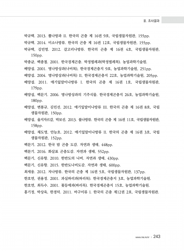 Ⅱ. 조사결과 www.nie.re.kr ? 243 박규택. 2013. 뿔나방과 II. 한국의 곤충 제 16권 9호, 국립생물자원관, 155pp. 박규택. 2014. 미소나방류. 한국의 곤충 제 16권 12호, 국립생물자원관, 155pp. 박규택, 김민영. 2012. 갈고리나방류. 한국의 곤충 제 16권 4호, 국립생물자원관, 150pp. 박종균, 백종철. 2001. 한국경제곤충. 딱정벌레과 딱정벌레목 농업과학기술원. 배양섭. 2001. 명나방상과 나비목 , 한국경제곤충지 9호, 농업과학기술원, 251pp. 배양섭. 2004. 명나방상과 나비목 II, 한국경제곤충지 22호, 농업과학기술원, 205pp. 배양섭. 2011. 애기잎말이나방류 I. 한국의 곤충 제 16권 1호, 국립생물자원관, 179pp. 배양섭,...