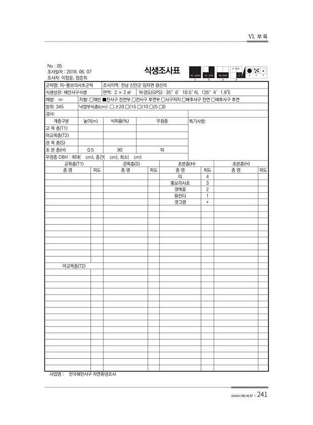 VI. 부 록 www.nie.re.kr ?241 No 05 조사일자 2018. 06. 07 조사자이정윤, 정준희 식생조사표 군락명띠-통보리사초군락 조사지역전남 신안군 임자면 광산리 식생상관해안사구식생 면적2 × 2 ㎡ 위?경도 GPS 35° 6′ 10.5″ N, 126° 4′ 1.8E 해발m 지형□해빈 ■전사구 전면부 □전사구 후면부 □사구저지 □배후사구 전면 □배후사구 후면 방위345 낙엽부식층 cm □.≥20 □ 15 □ 10 □ 5 □0 경사계층구분 높이 m 식피율 % 우점종 특기사항교 목 층 T1 아교목층 T2 관 목 층 S 초 본 층 H 0.5 90 띠 우점종 DBH 최대 cm , 중간 cm , 최소 cm 교목층 T1 관목층 S 초본층 H 초본층 H 종 명 피도 종 명 피도 종 명 피도 종 명 피도...