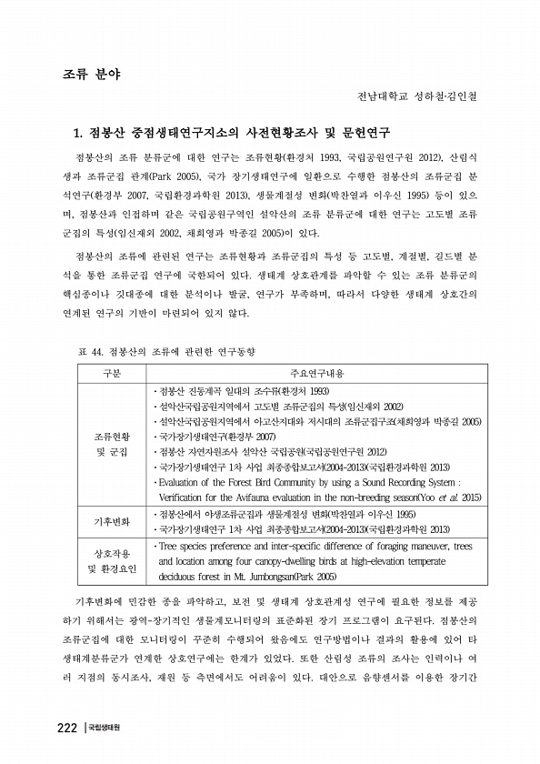 조류 분야 전남대학교 성하철?김인철 점봉산 중점생태연구지소의 사전현황조사 및 문헌연구 점봉산의 조류 분류군에 대한 연구는 조류현황 환경처 1993, 국립공원연구원 2012 , 산림식 생과 조류군집 관계 Park 2005 , 국가 장기생태연구에 일환으로 수행한 점봉산의 조류군집 분 석연구 환경부 2007, 국립환경과학원 2013 , 생물계절성 변화 박찬열과 이우신 1995 등이 있으 며, 점봉산과 인접하며 같은 국립공원구역인 설악산의 조류 분류군에 대한 연구는 고도별 조류 군집의 특성 임신재외 2002, 채희영과 박종길 2005 이 있다. 점봉산의 조류에 관련된 연구는 조류현황과 조류군집의 특성 등 고도별, 계절별, 길드별 분 석을 통한 조류군집 연구에 국한되어 있다. 생태계 상호관계를 파악할 수 있는 조류 ...