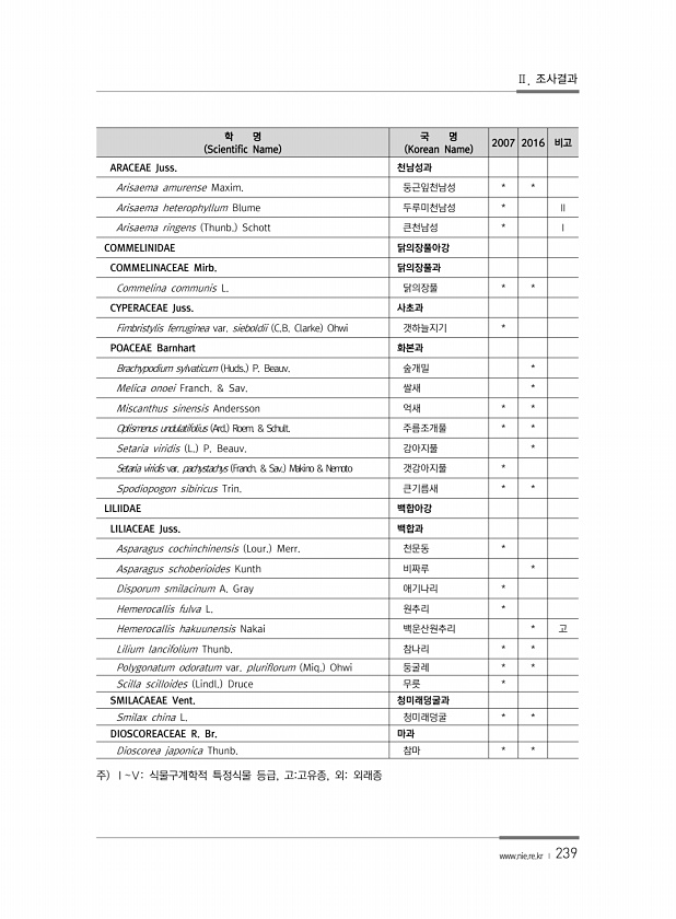 Ⅱ. 조사결과 www.nie.re.kr ? 239 학 명 Scientific Name 국 명 Korean Name 2007 2016 비고 ARACEAE Juss. 천남성과 Arisaema amurense Maxim. 둥근잎천남성 * * Arisaema heterophyllum Blume 두루미천남성 * Ⅱ Arisaema ringens Thunb. Schott 큰천남성 * Ⅰ COMMELINIDAE 닭의장풀아강 COMMELINACEAE Mirb. 닭의장풀과 Commelina communis L. 닭의장풀 * * CYPERACEAE Juss. 사초과 Fimbristylis ferruginea var. sieboldii C.B. Clarke Ohwi 갯하늘지기 * POACEAE Barnhart 화본과 Brach...