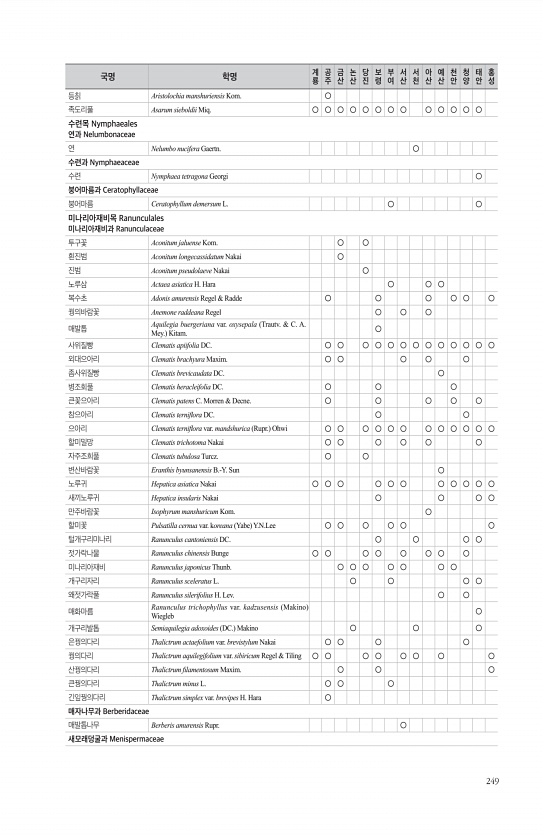 249 등칡 Aristolochia manshuriensis Kom. ○ 족도리풀 Asarum sieboldii Miq. ○ ○ ○ ○ ○ ○ ○ ○ ○ ○ ○ ○ ○ 수련목 Nymphaeales 연과 Nelumbonaceae 연 Nelumbo nucifera Gaertn. ○ 수련과 Nymphaeaceae 수련 Nymphaea tetragona Georgi ○ 붕어마름과 Ceratophyllaceae 붕어마름 Ceratophyllum demersum L. ○ ○ 미나리아재비목 Ranunculales 미나리아재비과 Ranunculaceae 투구꽃 Aconitum jaluense Kom. ○ ○ 흰진범 Aconitum longecassidatum Nakai ○ 진범 Aconitum pseudolaeve Nak...