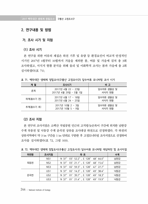 2017 백두대간 생태계 정밀조사 구룡산 고정조사구 244 ? National Institute of Ecology 2. 연구내용 및 방법 가. 조사 시기 및 지점 1 조사 시기 본 연구를 위한 어류의 채집은 하천 기후 및 유량 등 환경요인이 비교적 안정적인 시기인 2017년 4월부터 10월까지 겨울을 제외한 봄, 여름 및 가을에 걸쳐 총 3회 조사하였고, 서식지 현황 분석을 위해 물리 및 이화학적 조사는 봄과 가을에 총 2회 실시하였다 표 71 표 71. 백두대간 생태계 정밀조사 구룡산 고정조사구 담수어류 모니터링 조사 시기 계 절 조사시기 비 고 춘계 2017년 4월 22 23일 2017년 4월 29일 ? 5월 1일 담수어류 생물상 및 서식지 현황 하계 홍수기 전 2017년 6월 17 18일 2017년 ...