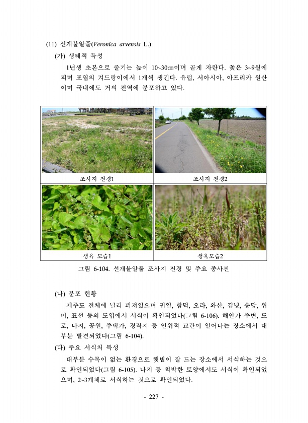 227 11 선개불알풀 Veronica arvensis L. 가 생태적 특성 1년생 초본으로 줄기는 높이 1030㎝이며 곧게 자란다. 꽃은 39월에 피며 포엽의 겨드랑이에서 1개씩 생긴다. 유럽, 서아시아, 아프리카 원산 이며 국내에도 거의 전역에 분포하고 있다. 조사지 전경1 조사지 전경2 생육 모습1 생육모습2 그림 6-104. 선개불알풀 조사지 전경 및 주요 종사진 나 분포 현황 제주도 전체에 널리 퍼져있으며 귀일, 함덕, 오라, 와산, 김녕, 송당, 위 미, 표선 등의 도엽에서 서식이 확인되었다 그림 6-106 해안가 주변, 도 로, 나지, 공원, 주택가, 경작지 등 인위적 교란이 일어나는 장소에서 대 부분 발견되었다 그림 6-104 다 주요 서식처 특성 대부분 수목이 없는 환경으로 햇볕이 잘 드는 ...