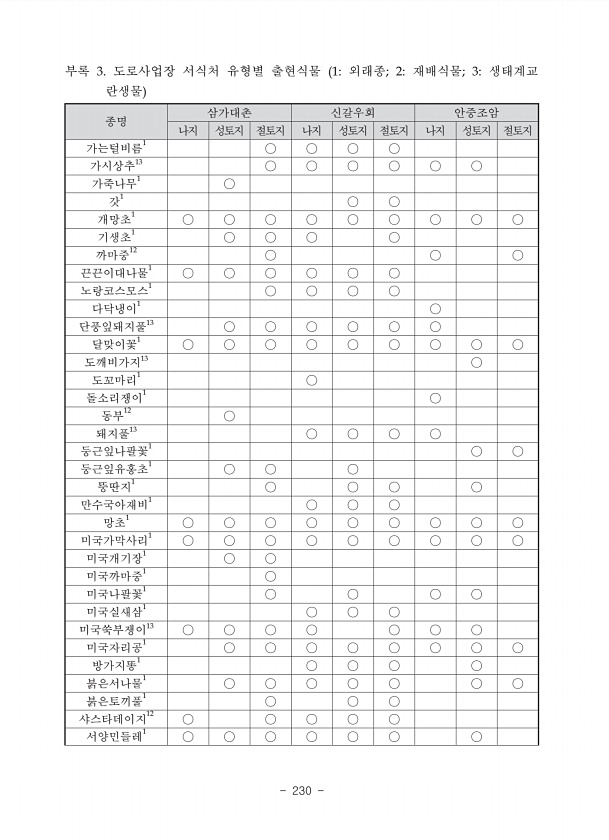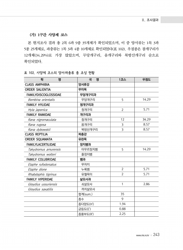Ⅱ. 조사결과 www.nie.re.kr ? 243 가 1구간 사양제 코스 본 현지조사 결과 총 2목 6과 9종 35개체가 확인되었으며, 이 중 양서류는 1목 3과 5종 25개체로, 파충류는 1목 3과 4종 10개체로 확인되었다 표 102 우점종은 참개구리가 12개체 34.29% 로 가장 많았으며, 무당개구리, 옴개구리와 북방산개구리 순으로 확인되었다. 학 명 국 명 1코스 우점도 CLASS AMPHIBIA 양서류강 ORDER SALIENTIA 무미목 FAMILYDISCOGLOSSIDAE 무당개구리과 Bombina orientalis 무당개구리 5 14.29 FAMILY HYLIDAE 청개구리과 Hyla japonica 청개구리 2 5.71 FAMILY RAMIDAE 개구리과 Rana nigromaculata...