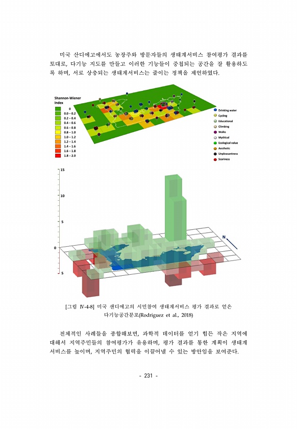 231 미국 산디에고에서도 농장주와 방문자들의 생태계서비스 참여평가 결과를 토대로, 다기능 지도를 만들고 이러한 기능들이 중첩되는 공간을 잘 활용하도 록 하며, 서로 상충되는 생태계서비스는 줄이는 정책을 제언하였다. [그림 Ⅳ-4-8] 미국 샌디에고의 시민참여 생태계서비스 평가 결과로 얻은 다기능공간분포 Rodriguez et al., 2018 전체적인 사례들을 종합해보면, 과학적 데이터를 얻기 힘든 작은 지역에 대해서 지역주민들의 참여평가가 유용하며, 평가 결과를 통한 계획이 생태계 서비스를 높이며, 지역주민의 협력을 이끌어낼 수 있는 방안임을보여준다.