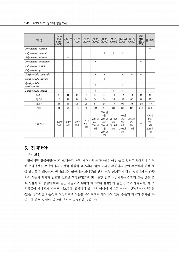 242 2015 독도 생태계 정밀조사 5. 관리방안 가. 보전 앞에서도 언급하였다시피 현재까지 독도 해조류의 종다양성은 매우 높은 것으로 판단되며 이러 한 종다양성을 보전하려는 노력이 절실히 요구된다. 이번 조사를 수행되는 동안 수중에서 대형 해 양 폐기물이 대량으로 발견되지는 않았지만 폐어구와 같은 소형 폐기물이 일부 정점에서는 관찰 되어 이들의 제거가 필요할 것으로 생각된다 그림 97 또한 일부 정점에서는 성게와 고둥 같은 조 식 동물이 타 정점에 비해 높은 비율로 서식하여 해조류의 섭식압이 높은 것으로 생각되며, 이 조 식동물이 과다하게 다년생 해조류를 섭식하게 될 경우 바다의 사막화 현상인 갯녹음현상 백화현 상 을 심화시킬 가능성도 예상되므로 이들을 주기적으로 제거하여 일정 수준의 개체가 유지될 수 ...
