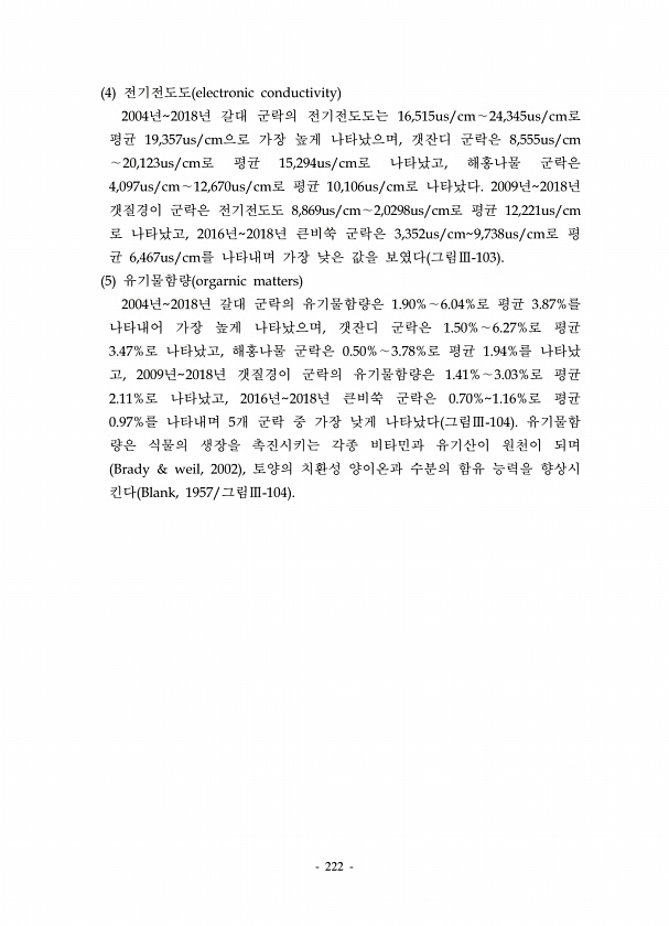 222 4 전기전도도 electronic conductivity 2004년2018년 갈대 군락의 전기전도도는 16,515us/cm∼24,345us/cm로 평균 19,357us/cm으로 가장 높게 나타났으며, 갯잔디 군락은 8,555us/cm ∼20,123us/cm로 평균 15,294us/cm로 나타났고, 해홍나물 군락은 4,097us/cm∼12,670us/cm로 평균 10,106us/cm로 나타났다. 2009년2018년 갯질경이 군락은 전기전도도 8,869us/cm∼2,0298us/cm로 평균 12,221us/cm 로 나타났고, 2016년2018년 큰비쑥 군락은 3,352us/cm9,738us/cm로 평 균 6,467us/cm를 나타내며 가장 낮은 값을 보였다 그림Ⅲ-103 5 유기물함량 orgarnic m...