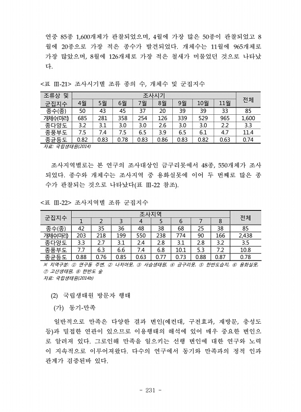 231 연중 종 개체가 관찰되었으며 월에 가장 많은 종이 관찰되었고 월에 종으로 가장 적은 종수가 발견되었다 개체수는 월에 개체로 가장 많았으며 월에 개체로 가장 적은 철새가 머물었던 것으로 나타났 다 조류상 및 군집지수 조사시기 전체 4월 5월 6월 7월 8월 9월 10월 11월 종수 종 50 43 45 37 20 39 39 33 85 개체수 마리 685 281 358 254 126 339 529 965 1,600 종다양도 3.2 3.1 3.0 3.0 2.6 3.0 3.0 2.2 3.3 종풍부도 7.5 7.4 7.5 6.5 3.9 6.5 6.1 4.7 11.4 종균등도 0.82 0.83 0.78 0.83 0.86 0.83 0.82 0.63 0.74 자료국립생태원 2014 표 조사시기별 조류 종의 수 개체수...