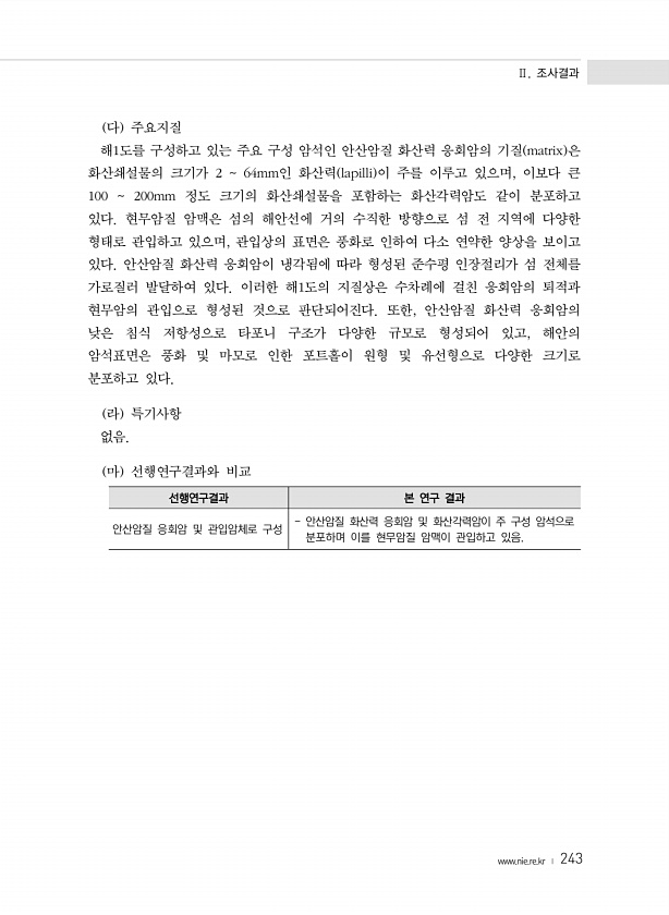 Ⅱ. 조사결과 www.nie.re.kr ? 243 다 주요지질 해1도를 구성하고 있는 주요 구성 암석인 안산암질 화산력 응회암의 기질 matrix 은 화산쇄설물의 크기가 2 64mm인 화산력 lapilli 이 주를 이루고 있으며, 이보다 큰 100 200mm 정도 크기의 화산쇄설물을 포함하는 화산각력암도 같이 분포하고 있다. 현무암질 암맥은 섬의 해안선에 거의 수직한 방향으로 섬 전 지역에 다양한 형태로 관입하고 있으며, 관입상의 표면은 풍화로 인하여 다소 연약한 양상을 보이고 있다. 안산암질 화산력 응회암이 냉각됨에 따라 형성된 준수평 인장절리가 섬 전체를 가로질러 발달하여 있다. 이러한 해1도의 지질상은 수차례에 걸친 응회암의 퇴적과 현무암의 관입으로 형성된 것으로 판단되어진다. 또한, 안산암질 화산력 ...