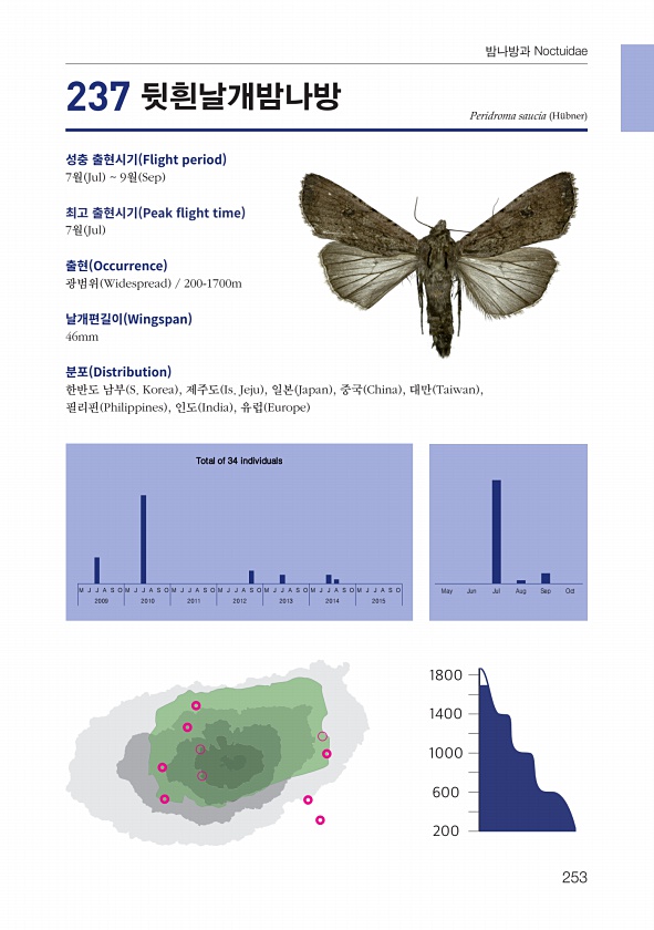 253 밤나방과 Noctuidae Peridroma saucia H?bner 성충 출현시기 Flight period 7월 Jul 9월 Sep 최고 출현시기 Peak fight time 7월 Jul 출현 Occurrence 광범위 Widespread 200-1700m 날개편길이 Wingspan 46mm 분포 Distribution 한반도 남부 S. Korea , 제주도 Is. Jeju , 일본 Japan , 중국 China , 대만 Taiwan , 필리핀 Philippines , 인도 India , 유럽 Europe 237 뒷흰날개밤나방 M J J A S O M J J A S O M J J A S O M J J A S O M J J A S O M J J A S O M J J A S O May Jun Jul A...