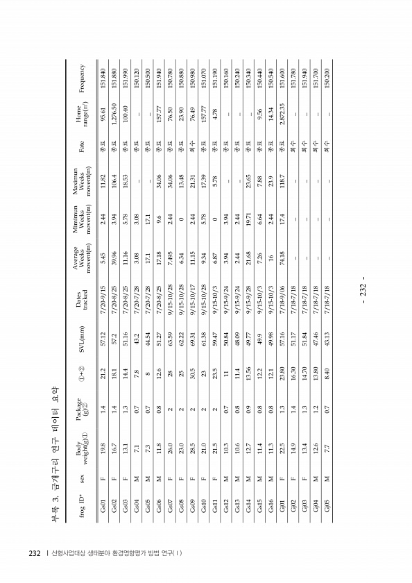 종료 종료 종료 종료 종료 종료 종료 종료 회수 종료 종료 종료 종료 종료 종료 종료 종료 회수 회수 회수 회수 부록 금개구리 연구 데이터 요약 232 | 선형사업대상 생태분야 환경영향평가 방법 연구 Ⅰ