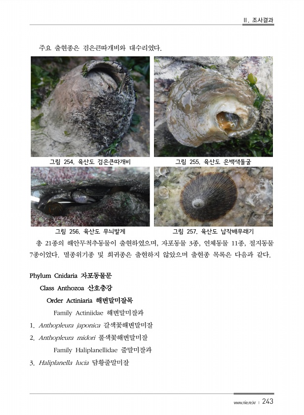 Ⅱ. 조사결과 www.nie.re.kr ? 243 주요 출현종은 검은큰따개비와 대수리였다. 그림 254. 육산도 검은큰따개비 그림 255. 육산도 은백색돌굴 그림 256. 육산도 무늬발게 그림 257. 육산도 납작배무래기 총 21종의 해안무척추동물이 출현하였으며, 자포동물 3종, 연체동물 11종, 절지동물 7종이었다. 멸종위기종 및 희귀종은 출현하지 않았으며 출현종 목록은 다음과 같다. Phylum Cnidaria 자포동물문 Class Anthozoa 산호충강 Order Actiniaria 해변말미잘목 Family Actiniidae 해변말미잘과 1. Anthopleura japonica 갈색꽃해변말미잘 2. Anthopleura midori 풀색꽃해변말미잘 Family Haliplanellidae 줄말미잘...