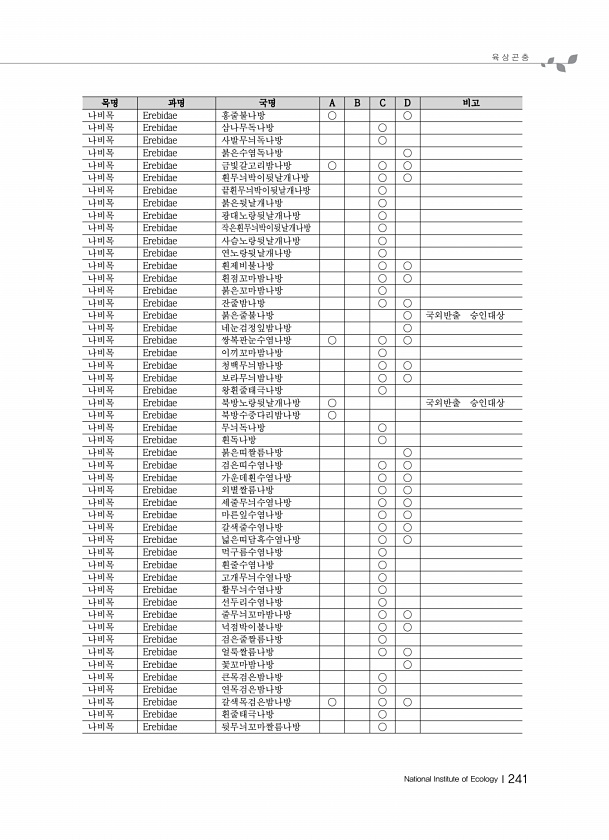 육 상 곤 충 National Institute of EcologyⅠ241 목명 과명 국명 A B C D 비고 나비목 Erebidae 홍줄불나방 ○ ○ 나비목 Erebidae 삼나무독나방 ○ 나비목 Erebidae 사발무늬독나방 ○ 나비목 Erebidae 붉은수염독나방 ○ 나비목 Erebidae 금빛갈고리밤나방 ○ ○ ○ 나비목 Erebidae 흰무늬박이뒷날개나방 ○ ○ 나비목 Erebidae 끝흰무늬박이뒷날개나방 ○ 나비목 Erebidae 붉은뒷날개나방 ○ 나비목 Erebidae 광대노랑뒷날개나방 ○ 나비목 Erebidae 작은흰무늬박이뒷날개나방 ○ 나비목 Erebidae 사슴노랑뒷날개나방 ○ 나비목 Erebidae 연노랑뒷날개나방 ○ 나비목 Erebidae 흰제비불나방 ○ ○ 나비목 Erebidae 흰점...