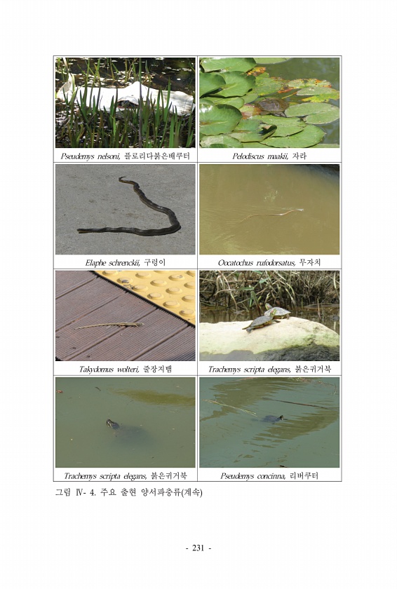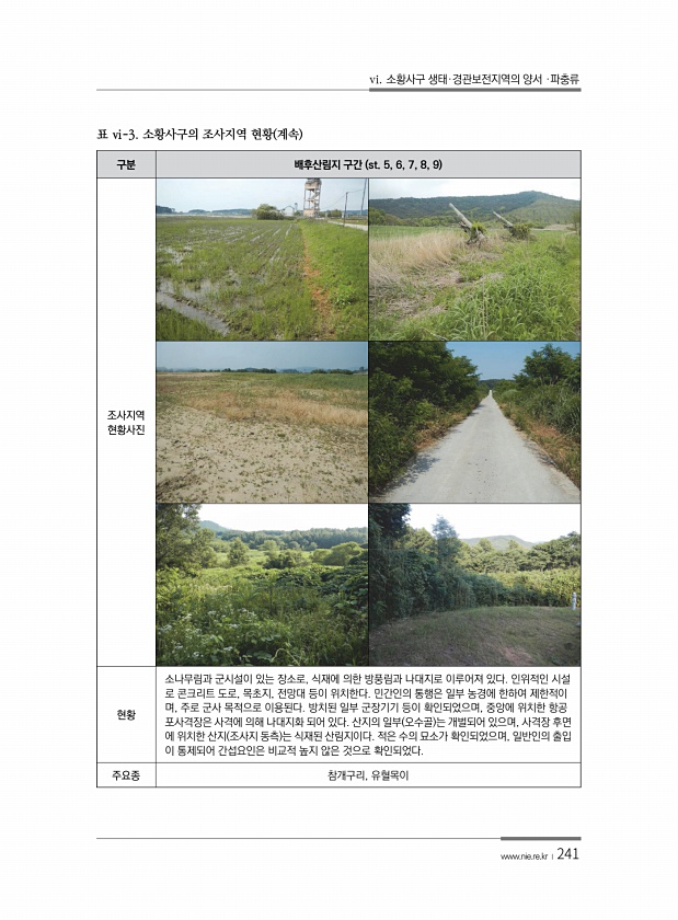 vi. 소황사구 생태·경관보전지역의 양서 ·파충류 www.nie.re.kr ?241 구분 배후산림지 구간 st. 5, 6, 7, 8, 9 조사지역 현황사진 현황 소나무림과 군시설이 있는 장소로, 식재에 의한 방풍림과 나대지로 이루어져 있다. 인위적인 시설 로 콘크리트 도로, 목초지, 전망대 등이 위치한다. 민간인의 통행은 일부 농경에 한하여 제한적이 며, 주로 군사 목적으로 이용된다. 방치된 일부 군장기기 등이 확인되었으며, 중앙에 위치한 항공 포사격장은 사격에 의해 나대지화 되어 있다. 산지의 일부 오수골 는 개벌되어 있으며, 사격장 후면 에 위치한 산지 조사지 동측 는 식재된 산림지이다. 적은 수의 묘소가 확인되었으며, 일반인의 출입 이 통제되어 간섭요인은 비교적 높지 않은 것으로 확인되었다. 주요종 참...