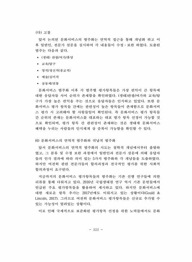 222 다 고찰 앞서 논의된 문화서비스의 범주화는 연역적 접근을 통해 개념화 하고 이 후 일반인, 전문가 설문을 실시하여 각 내용들이 수정·보완 하였다. 도출된 범주는 다음과 같다. ? 생태 관광/여가/휴양 ? 교육/탐구 ? 영적/정신적 종교적 ? 예술/심미적 ? 공동체/전통 문화서비스 범주화 이후 각 범주별 평가항목들은 가장 편익이 큰 항목에 대한 응답자들 사이 순위가 존재함을 확인하였다. 생태 관광/여가와 교육/탐 구가 가장 높은 편익을 주는 것으로 응답자들은 인식하고 있었다. 또한 문 화서비스 평가 항목들 간에는 관련성이 높은 항목들이 존재함으로 문화서비 스 평가 시 고려해야 할 사항들임이 확인된다. 즉 문화서비스 평가 항목들 간 순위의 존재는 문화서비스를 대표하는 대표 평가 항목 선정이 가능할 것 으...