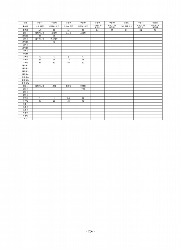 구분 구운44 구운45 구운46 구운47 구운48 구운49 구운50 구운51 구운52 중분류 산림 활엽 조경수 침엽 조경수 침엽 조경수 침엽 시설지 및 포장지 시설지 및 포장지 기타 인공지역 시설지 포장지및 시설지 포장지및 소분류 A2 B2 B1 B1 D1 D3 F1 D4 D2 교목1 아까시나무 소나무 소나무 소나무 교목1% 90 40 교목2 상수리나무 버드나무 교목2% 40 교목3 교목3% 교목4 교목4% 교목H 16 6 6 6 교목D 23 14 14 14 교목% 90 60 60 60 아교목1 아교목2 아교목3 아교목4 아교목H 아교목D 아교목% 관목1 아까시나무 주목 회양목 회양목 관목2 주목 관목3 관목4 관목H 1 1 0.6 0.6 관목% 25 20 20 15 초본1 초본2 초본3 초본H 초본% 비고...