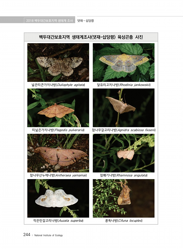 2018 백두대간보호지역 생태계 조사 댓재 삽당령 244 ? National Institute of Ecology 백두대간보호지역 생태계조사 댓재삽당령 육상곤충 사진 넓은띠큰가지나방 Duliophyle agitata 달유리고치나방 Rhodinia jankowskii 띠넓은가지나방 Plagodis pulveraria 참나무갈고리나방 Agnidra scabiosa fixseni 참나무산누에나방 Antheraea yamamai 참쐐기나방 Rhamnosa angulata 작은민갈고리나방 Auzata superba 콩독나방 Cifuna locuples