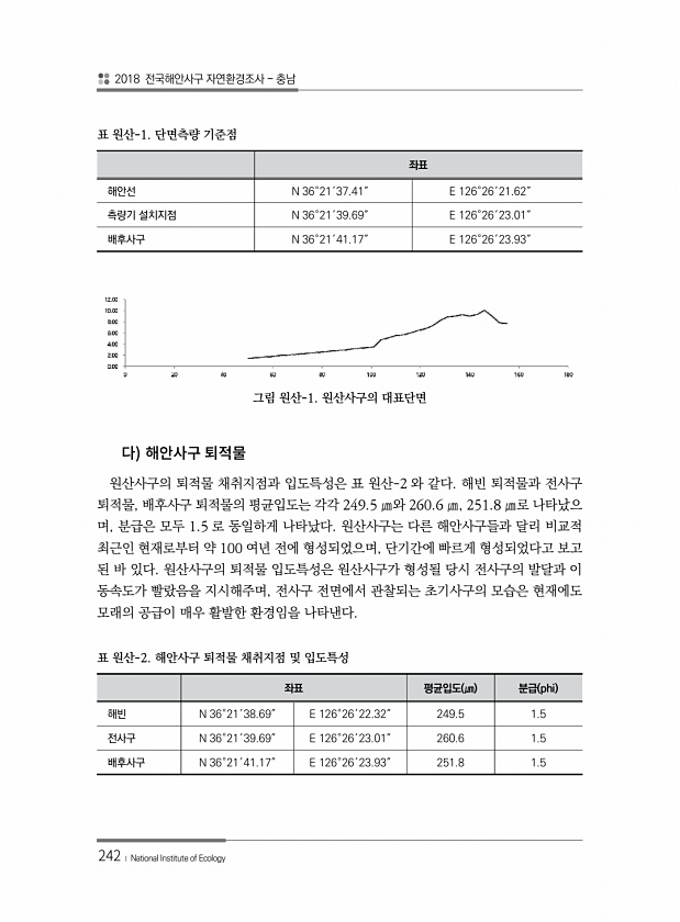 2018 전국해안사구 자연환경조사 충남 242 ? National Institute of Ecology 좌표 해안선 N 36°21′37.41″ E 126°26′21.62″ 측량기 설치지점 N 36°21′39.69″ E 126°26′23.01″ 배후사구 N 36°21′41.17″ E 126°26′23.93″ 표 원산-1. 단면측량 기준점 그림 원산-1. 원산사구의 대표단면 원산사구의 퇴적물 채취지점과 입도특성은 표 원산-2 와 같다. 해빈 퇴적물과 전사구 퇴적물, 배후사구 퇴적물의 평균입도는 각각 249.5 ㎛와 260.6 ㎛, 251.8 ㎛로 나타났으 며, 분급은 모두 1.5 로 동일하게 나타났다. 원산사구는 다른 해안사구들과 달리 비교적 최근인 현재로부터 약 100 여년 전에 형성되었으며, 단기간에 빠르게...