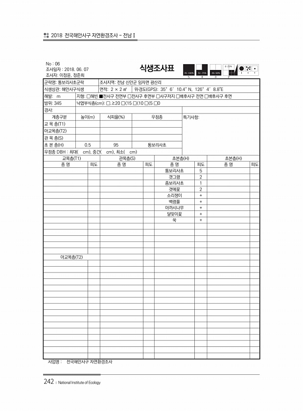 2018 전국해안사구 자연환경조사 전남Ⅰ 242 ? National Institute of Ecology No 06 조사일자 2018. 06. 07 조사자이정윤, 정준희 식생조사표 군락명통보리사초군락 조사지역전남 신안군 임자면 광산리 식생상관해안사구식생 면적2 × 2 ㎡ 위?경도 GPS 35° 6′ 10.4″ N, 126° 4′ 8.8E 해발m 지형□해빈 ■전사구 전면부 □전사구 후면부 □사구저지 □배후사구 전면 □배후사구 후면 방위345 낙엽부식층 cm □.≥20 □ 15 □ 10 □ 5 □0 경사계층구분 높이 m 식피율 % 우점종 특기사항교 목 층 T1 아교목층 T2 관 목 층 S 초 본 층 H 0.5 95 통보리사초 우점종 DBH 최대 cm , 중간 cm , 최소 cm 교목층 T1 관목층 S 초본층 H...