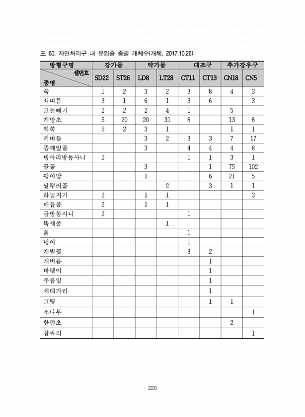 방형구명 강가뭄 약가뭄 대조구 추가강우구 셀번호 종명 SD22 ST26 LD8 LT28 CT11 CT13 CN18 CN5 쑥 1 2 3 2 3 8 4 3 쇠비름 3 1 6 1 3 6 3 고들빼기 2 2 2 4 1 5 개망초 5 20 20 31 8 13 8 떡쑥 5 2 3 1 1 1 키버들 3 2 3 3 7 17 좀깨잎풀 3 4 4 4 8 병아리방동사니 2 1 1 3 1 골풀 3 1 75 102 괭이밥 1 6 21 5 달뿌리풀 2 3 1 1 하늘지기 2 1 1 3 매듭풀 2 1 1 금방동사니 2 1 뚝새풀 1 칡 1 냉이 1 개별꽃 3 2 개비름 1 바랭이 1 주름잎 1 세대가리 1 그령 1 1 소나무 1 한련초 2 참싸리 1 표 60. 자연처리구 내 유입종 종별 개체수 개체, 2017.10.26 220