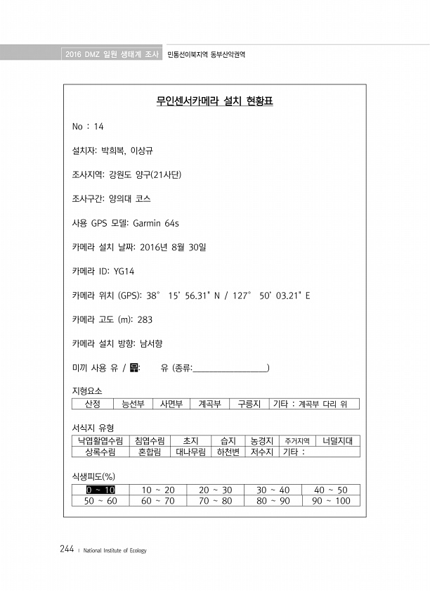 2016 DMZ 일원 생태계 조사 민통선이북지역 동부산악권역 244 ? National Institute of Ecology 무인센서카메라 설치 현황표 No 14 설치자박희복, 이상규 조사지역강원도 양구 21사단 조사구간양의대 코스 사용 GPS 모델Garmin 64s 카메라 설치 날짜2016년 8월 30일 카메라 IDYG14 카메라 위치 GPS 38° 15’ 56.31N 127° 50’ 03.21E 카메라 고도 m 283 카메라 설치 방향남서향 미끼 사용 유 무유 종류__________________ 지형요소 산정 능선부 사면부 계곡부 구릉지 기타 계곡부 다리 위 서식지 유형 낙엽활엽수림 침엽수림 초지 습지 농경지 주거지역 너덜지대 상록수림 혼합림 대나무림 하천변 저수지 기타 식생피도 % 0 10 10 20...