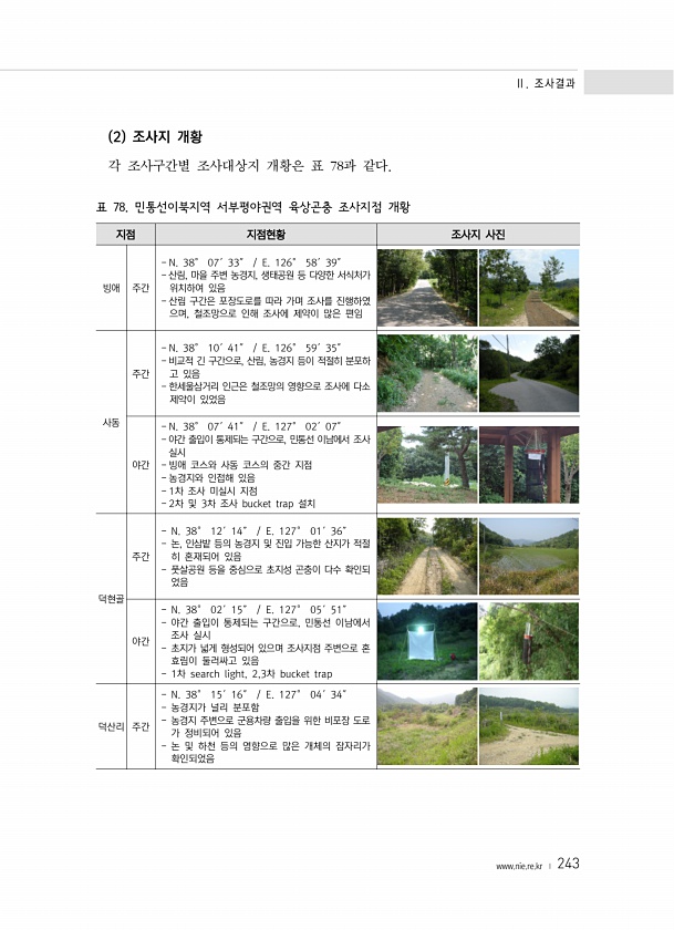 Ⅱ. 조사결과 www.nie.re.kr ? 243 2 조사지 개황 각 조사구간별 조사대상지 개황은 표 78과 같다. 지점 지점현황 조사지 사진 빙애 주간 N. 38° 07′33″ E. 126° 58′39″ 산림, 마을 주변 농경지, 생태공원 등 다양한 서식처가 위치하여 있음 산림 구간은 포장도로를 따라 가며 조사를 진행하였 으며, 철조망으로 인해 조사에 제약이 많은 편임 사동 주간 N. 38° 10′41″ E. 126° 59′35″ 비교적 긴 구간으로, 산림, 농경지 등이 적절히 분포하 고 있음 한세울삼거리 인근은 철조망의 영향으로 조사에 다소 제약이 있었음 야간 N. 38° 07′41″ E. 127° 02′07″ 야간 출입이 통제되는 구간으로, 민통선 이남에서 조사 실시 빙애 코스와 사동 코스의 중간 지점...
