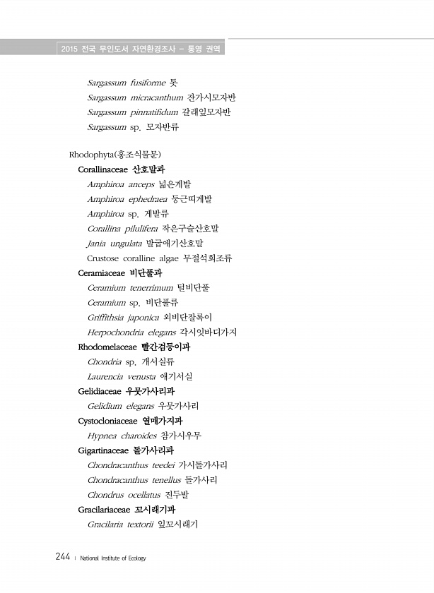 2015 전국 무인도서 자연환경조사 통영 권역 244 ? National Institute of Ecology Sargassum fusiforme 톳 Sargassum micracanthum 잔가시모자반 Sargassum pinnatifidum 갈래잎모자반 Sargassum sp. 모자반류 Rhodophyta 홍조식물문 Corallinaceae 산호말과 Amphiroa anceps 넓은게발 Amphiroa ephedraea 둥근띠게발 Amphiroa sp. 게발류 Corallina pilulifera 작은구슬산호말 Jania ungulata 발굽애기산호말 Crustose coralline algae 무절석회조류 Ceramiaceae 비단풀과 Ceramium tenerrimum 털비단풀 Ceramium sp....