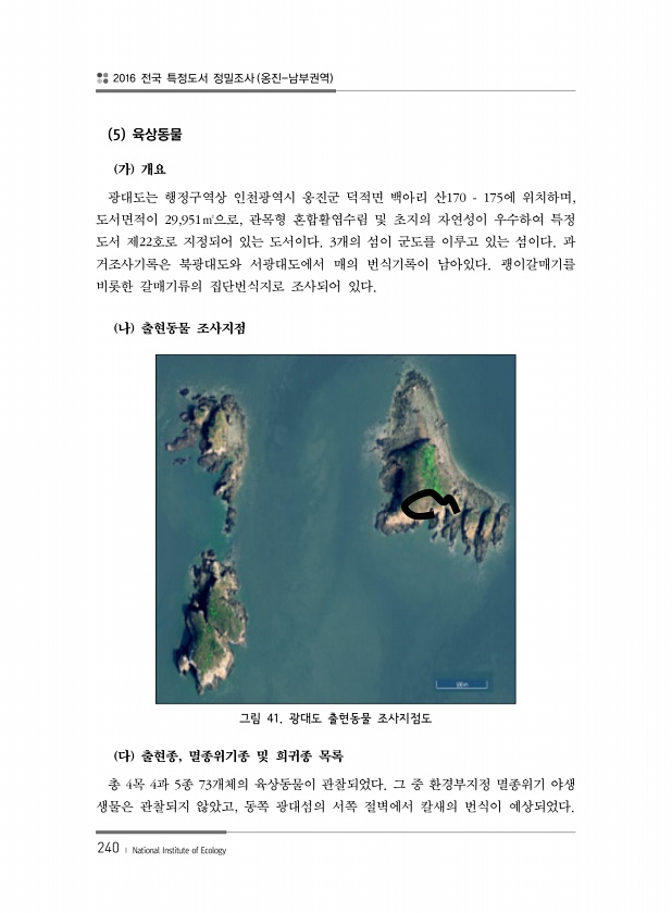 2016 전국 특정도서 정밀조사 옹진-남부권역 240 ? National Institute of Ecology 5 육상동물 가 개요 광대도는 행정구역상 인천광역시 옹진군 덕적면 백아리 산170 175에 위치하며, 도서면적이 29,951㎡으로, 관목형 혼합활엽수림 및 초지의 자연성이 우수하여 특정 도서 제22호로 지정되어 있는 도서이다. 3개의 섬이 군도를 이루고 있는 섬이다. 과 거조사기록은 북광대도와 서광대도에서 매의 번식기록이 남아있다. 괭이갈매기를 비롯한 갈매기류의 집단번식지로 조사되어 있다. 나 출현동물 조사지점 그림 41. 광대도 출현동물 조사지점도 다 출현종, 멸종위기종 및 희귀종 목록 총 4목 4과 5종 73개체의 육상동물이 관찰되었다. 그 중 환경부지정 멸종위기 야생 생물은 관찰되지 않았고, ...