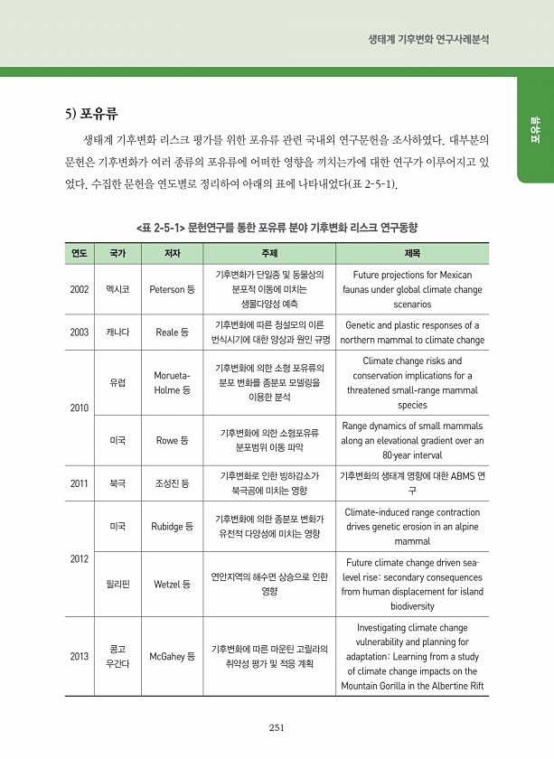 251 생태계 기후변화 연구사례분석 포유류 5 포유류 생태계 기후변화 리스크 평가를 위한 포유류 관련 국내외 연구문헌을 조사하였다. 대부분의 문헌은 기후변화가 여러 종류의 포유류에 어떠한 영향을 끼치는가에 대한 연구가 이루어지고 있 었다. 수집한 문헌을 연도별로 정리하여 아래의 표에 나타내었다 표 2-5-1 표 2-5-1 문헌연구를 통한 포유류 분야 기후변화 리스크 연구동향 연도 국가 저자 주제 제목 2002 멕시코 Peterson 등 기후변화가 단일종 및 동물상의 분포적 이동에 미치는 생물다양성 예측 Future projections for Mexican faunas under global climate change scenarios 2003 캐나다 Reale 등 기후변화에 따른 청설모의 이른 번식시기에 ...