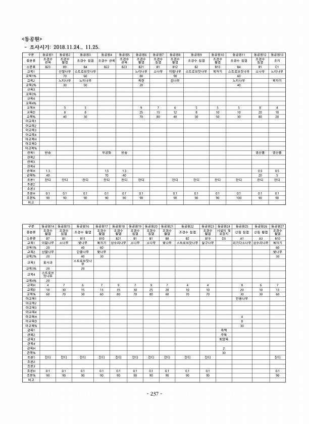 동공원 조사시기2018.11.24., 11.25. 구분 동공원1 동공원2 동공원3 동공원4 동공원5 동공원6 동공원7 동공원8 동공원9 동공원10 동공원11 동공원12 동공원13 중분류 조경수 관목 조경수 활엽 조경수 침엽 조경수 관목 조경수 관목 조경수 활엽 조경수 침엽 조경수 활엽 조경수 침엽 조경수 활엽 조경수 침엽 조경수 침엽 초지 소분류 B23 B9 B4 B22 B23 B21 B1 B12 B2 B13 B4 B1 C1 교목1 산딸나무 스트로브잣나무 느티나무 소나무 이팝나무 스트로브잣나무 복자기 스트로브잣나무 소나무 느티나무 교목1% 70 60 80 90 60 교목2 느티나무 느티나무 목련 감나무 느티나무 복자기 교목2% 30 50 20 40 교목3 교목3% 교목4 교목4% 교목H 5 5 9 7 6 5...