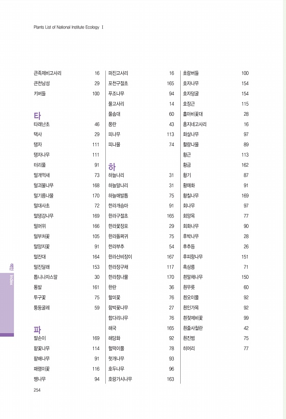 254 색인 Index Plants List of National Institute Ecology Ⅰ 큰족제비고사리 16 큰천남성 29 키버들 100 타 타래난초 46 택사 29 탱자 111 탱자나무 111 터리풀 91 털개억새 73 털괴불나무 168 털기름나물 170 털대사초 72 털댕강나무 169 털머위 166 털부처꽃 105 털양지꽃 91 털잔대 164 털진달래 153 톱니나자스말 30 통발 161 투구꽃 75 퉁둥굴레 59 파 팔손이 169 팥꽃나무 114 팥배나무 91 패랭이꽃 116 팽나무 94 퍼진고사리 16 포천구절초 165 푸조나무 94 풀고사리 14 풀솜대 60 풍란 43 피나무 113 피나물 74 하 하늘나리 31 하늘말나리 31 하늘매발톱 75 한라개승마 91 한라구절초 165 한라꽃장...