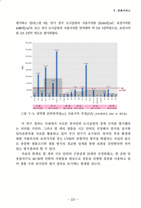 Ⅴ. 문화서비스 227 평가하고 있다 그림 93 당시 전국 도시공원의 사용가치를 25,616원/m2, 보전가치를 4,080원/m2로 보고 전국 도시공원의 사용가치를 면적대비 약 5조 3천억원으로, 보전가치 를 2조 2천억 정도로 평가하였다. 그림 Ⅴ 3. 권역별 단위면적당 ㎡ 사용가치 추정 1년 국토해양부, 2011 표 재인용 이 연구 결과는 국내에서 시도된 전국단위 도시공원의 경제 가치를 평가했다 는 의의를 가진다. 그러나 몇 개의 샘플을 시도 단위로 선정해서 분석을 실시한 임의표본추출 자료를 활용하고 있어 추가 연구가 요구된다. 하지만 특정 환경에 대한 지불의사와 보전가치를 묻는 CVM의 전형적인 방식을 따랐다는 사실과 앞으 로 충분한 샘플크기와 샘플 방식의 정교한 설계를 통한 보완을 감안한다면 의미 있...