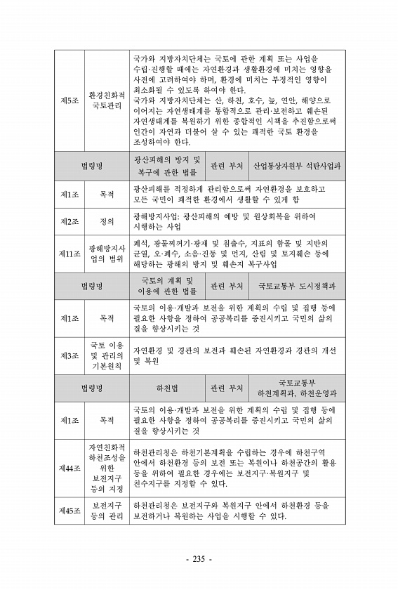 제5조 환경친화적 국토관리 국가와 지방자치단체는 국토에 관한 계획 또는 사업을 수립·진행할 때에는 자연환경과 생활환경에 미치는 영향을 사전에 고려하여야 하며, 환경에 미치는 부정적인 영향이 최소화될 수 있도록 하여야 한다. 국가와 지방자치단체는 산, 하천, 호수, 늪, 연안, 해양으로 이어지는 자연생태계를 통합적으로 관리·보전하고 훼손된 자연생태계를 복원하기 위한 종합적인 시책을 추진함으로써 인간이 자연과 더불어 살 수 있는 쾌적한 국토 환경을 조성하여야 한다. 법령명 광산피해의 방지 및 복구에 관한 법률 관련 부처 산업통상자원부 석탄사업과 제1조 목적 광산피해를 적정하게 관리함으로써 자연환경을 보호하고 모든 국민이 쾌적한 환경에서 생활할 수 있게 함 제2조 정의 광해방지사업광산피해의 예방 및 원상회복을 위...