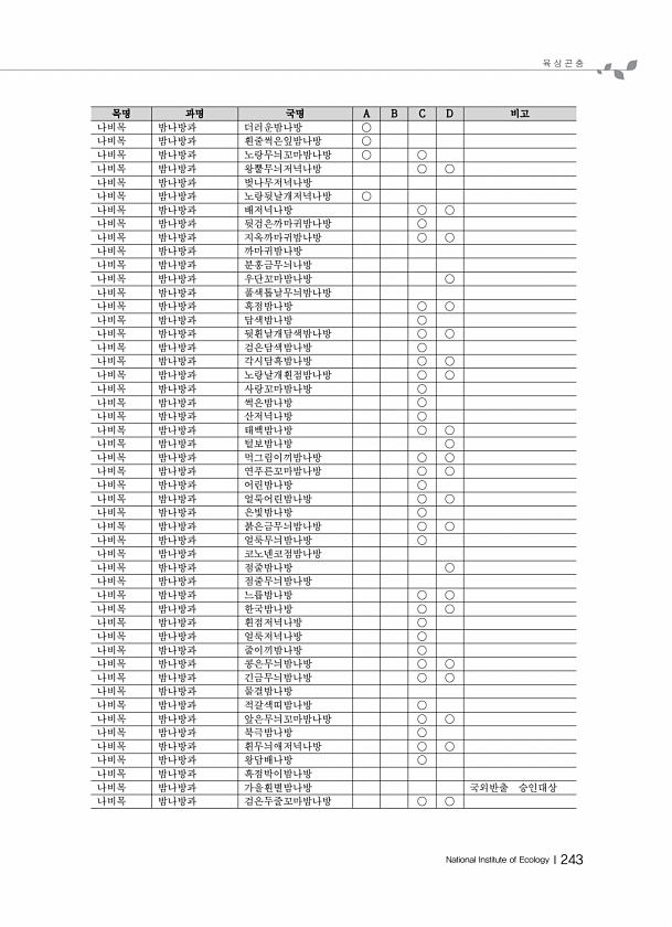 육 상 곤 충 National Institute of EcologyⅠ243 목명 과명 국명 A B C D 비고 나비목 밤나방과 더러운밤나방 ○ 나비목 밤나방과 흰줄썩은잎밤나방 ○ 나비목 밤나방과 노랑무늬꼬마밤나방 ○ ○ 나비목 밤나방과 왕뿔무늬저녁나방 ○ ○ 나비목 밤나방과 벚나무저녁나방 나비목 밤나방과 노랑뒷날개저녁나방 ○ 나비목 밤나방과 배저녁나방 ○ ○ 나비목 밤나방과 뒷검은까마귀밤나방 ○ 나비목 밤나방과 지옥까마귀밤나방 ○ ○ 나비목 밤나방과 까마귀밤나방 나비목 밤나방과 분홍금무늬나방 나비목 밤나방과 우단꼬마밤나방 ○ 나비목 밤나방과 풀색톱날무늬밤나방 나비목 밤나방과 흑점밤나방 ○ ○ 나비목 밤나방과 담색밤나방 ○ 나비목 밤나방과 뒷흰날개담색밤나방 ○ ○ 나비목 밤나방과 검은담색밤나방 ○ 나비목 밤나...