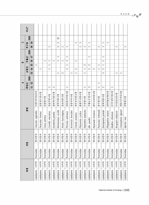 육 상 곤 충 National Institute of EcologyⅠ243 목명 과명 종명 A B C 희양산 비고* 2008 조령산 주흘산 2008 투구봉 2008 S1 S2 S3 S4 S5 S6 S7 S8 S9 Lepidoptera 나비목 Noctuidae 밤나방과 Catocala nagioides 작은흰무늬박이뒷날개나방 1 Lepidoptera 나비목 Noctuidae 밤나방과 Paracolax fentoni 잔물결수염나방 1 Lepidoptera 나비목 Noctuidae 밤나방과 Corsa petrina 잔줄밤나방 1 Lepidoptera 나비목 Noctuidae 밤나방과 Cucullia maculosa 점곱추밤나방 1 1 1 1 1 Lepidoptera 나비목 Noctuidae 밤나방과 Dysmili...