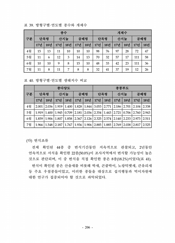 206 구분 종수 개체수 단목령 산지늪 곰배령 단목령 산지늪 곰배령 17년 18년 17년 18년 17년 18년 17년 18년 17년 18년 17년 18년 4월 15 13 11 10 10 10 98 76 97 28 72 47 5월 11 6 12 3 14 13 70 32 57 17 111 58 6월 10 10 9 8 15 10 48 33 42 23 111 36 7월 11 8 11 7 8 8 32 41 37 19 12 26 표 39. 방형구별·연도별 종수와 개체수 구분 종다양도 종풍부도 단목령 산지늪 곰배령 단목령 산지늪 곰배령 17년 18년 17년 18년 17년 18년 17년 18년 17년 18년 17년 18년 4월 2.001 2.036 1.919 1.400 1.828 1.844 3.053 2.771 2.186...