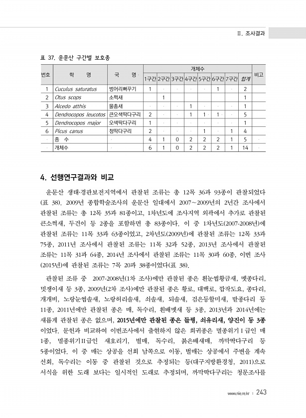 Ⅱ. 조사결과 www.nie.re.kr ? 243 표 37. 운문산 구간별 보호종 번호 학 명 국 명 개체수 비고 1구간 2구간 3구간 4구간 5구간 6구간 7구간 합계 1 Cuculus saturatus 벙어리뻐꾸기 1 1 2 2 Otus scops 소쩍새 1 1 3 Alcedo atthis 물총새 1 1 4 Dendrocopos leucotos 큰오색딱다구리 2 1 1 1 5 5 Dendrocopos major 오색딱다구리 1 1 6 Picus canus 청딱다구리 2 1 1 4 종 수 4 1 0 2 2 2 1 5 개체수 6 1 0 2 2 2 1 14 4. 선행연구결과와 비교 운문산 생태?경관...