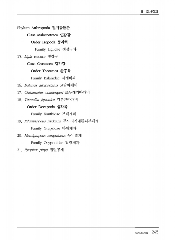 Ⅱ. 조사결과 www.nie.re.kr ? 245 Phylum Arthropoda 절지동물문 Class Malacostraca 연갑강 Order Isopoda 등각목 Family Ligiidae 갯강구과 15. Ligia exotica 갯강구 Class Crustacea 갑각강 Order Thoracica 완흉목 Family Balanidae 따개비과 16. Balanus albicostatus 고랑따개비 17. Chthamalus challengeri 조무래기따개비 18. Tetraclita japonica 검은큰따개비 Order Decapoda 십각목 Family Xanthidae 부채게과 19. Pilumnopeus makiana 두드러기네톱니부채게 Family Grapsidae 바위게과 20. Hem...