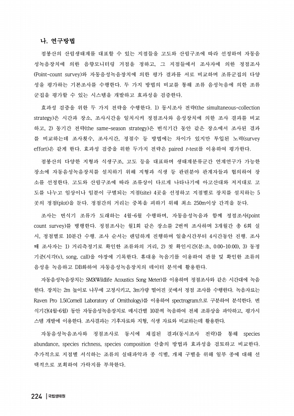 나 연구방법 점봉산의 산림생태계를 대표할 수 있는 지점들을 고도와 산림구조에 따라 선정하여 자동음 성녹음장치에 의한 음향모니터링 거점을 정하고, 그 지점들에서 조사자에 의한 정점조사 Point-count survey 와 자동음성녹음장치에 의한 평가 결과를 서로 비교하며 조류군집의 다양 성을 평가하는 기본조사를 수행한다. 두 가지 방법의 비교를 통해 조류 음성녹음에 의한 조류 군집을 평가할 수 있는 시스템을 개발하고 효과성을 검증한다. 효과성 검증을 위한 두 가지 전략을 수행한다. 1 동시조사 전략 the simultaneous-collection strategy 은 시간과 장소, 조사시간을 일치시켜 정점조사와 음성장치에 의한 조사 결과를 비교 하고, 2 동기간 전략 the same-season strateg...